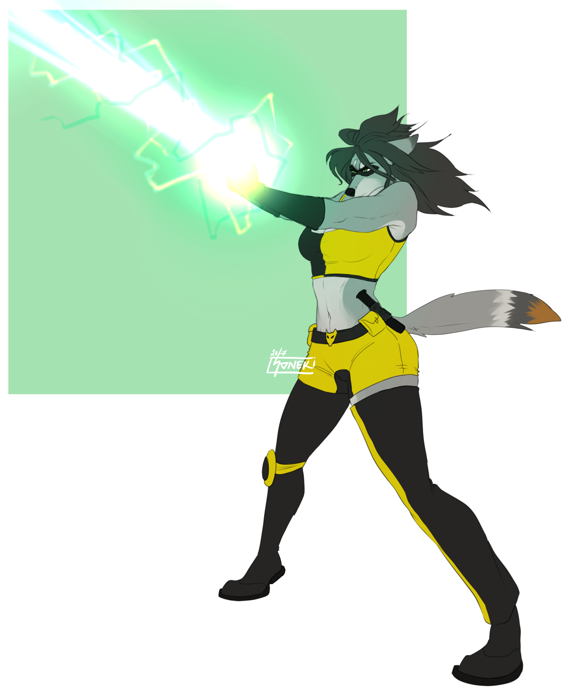 Her outfit is mainly black and yellow in colour she has a tank top with a flowing scarf and an opening in the middle just above her breasts to prevent herself from overheating. She also has an interesting pants design in which her right side is completely covered but her left leg is covered only down to her upper thigh, leaving a space and then continuing down from her lower thigh with what looks like part of a legging stocking. She has black boots which are partly covered by her pants and also has a pair of long gloves which are usually covering up to her forearm but can be extended to cover midway up her upper arms. She has a black eye mask which covers up half of her orange face marking, keeping her disguise a secret as the facial markings of a tribal wolf can be used to identify an individual. Finally, she has her black utility belt which carries her equipment and features her trademark wolf head belt buckle. Her outfit is completely made out of a composite of latex, padded leather, spandex, kevlar fibers and is form fitting.
